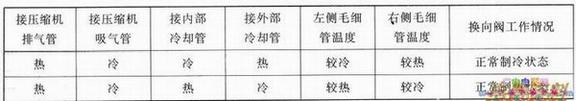 (1)用手触摸换向阀六根管子温度,与正常状态下管子温度比较。如果手摸换向阀六根管子温度与正常温度相差过大时,说明换向阀有故障,正常状态下四通换向阀六根管子温度如下表所示。