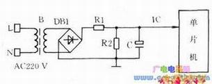 下图电路常见故障原因多为R2阻值变化、C漏电或开路。检修时可测DB1输出端有无直流电压,有电压说明DB1之前电路正常,无电压说明DB1或B某个元件损坏。检修时也可用47k电位器替换下R2,插上电源并接入调压器,将调压器输出电压调至245V,调整电位器使过欠压灯不亮或不过欠压保护。然后再将调压器输出电压调至190V,使过欠压灯不亮或不过欠压保护,这样就完成了电源过欠压的调整。调整结束后测量电位器值,然后用同阻值固定替换电位器。