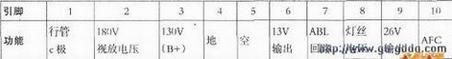 | 功能 | 行管 | 180V | 130V | 地 | -13V | 17V | ABL | 灯丝 | 空 | AFC |