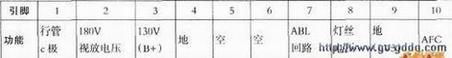 | 功能 | 行管 | 180V | 130V | 地 | -13V | 17V | ABL | 灯丝 | 空 | AFC |