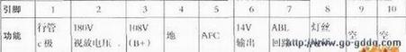 | 功能 | 行管 | 180V | 130V | 地 | -13V | 17V | ABL | 灯丝电压 | 空 | AFC |