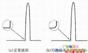 (1)根据波形判断行输出管工作状态:下图是行激励不足的行逆程脉冲波形,行激励不足严重时,立即烧“行管”,轻则会出现“行管”工作温度较平时高,不定时烧“行管”。根据波形判断的标准是:行脉冲左下脚,正常必须是直角[下图(a)所示],如果此脚出现圆弧状[下图(b)所示],即为行激励不足,要立即检查行激励部分的工作状态。