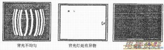 因背光单元引起的故障除了背光灯不良、背光灯亮度降低等现象外,还有如下图所示的背光不均匀、漏光,以及背光灯处的异物在屏幕上产生黑或白色的圆形、线状图案等现象。