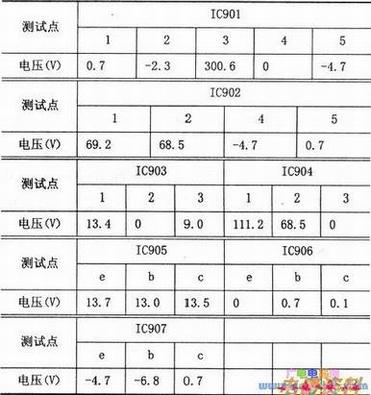 修电源时,测量关键元件的对地电阻和电压,是判断故障的有效手段之一。日立C21D8C彩电电源系统集成块IC901(STR-D6601)、IC902(光电耦合器)、IC903(9V稳压器)、IC904(SE110N)的实测数据和三极管Q905、Q906、Q907的对地电压见表所示。