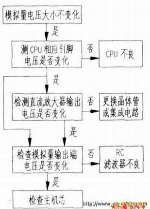 模拟量控制的工作原理比较单纯,故障率相对较低。在检修模拟量控制电路时,其外电路一般各自独立,互不影响。故障出现时大都可以通过、测量法很容易找到故障点。只要掌握控制端到受控端各电压的控制范围。通过测试相关点的电压,即可判断出故障部位。各模拟量的控制电压是由CPU内部产生的。所以首先应检测各输出端电压。若这部分电路出现异常,则表现为模拟量不可调或调节范围不够。下图是模拟量控制电路的检修流程,