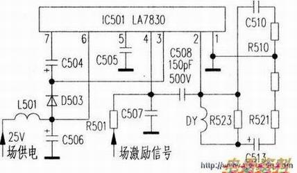 场输出块功率输出级常接成推挽。为了提高效率和满足场消隐的要求。在场逆程期间不少场块利用自举升压电路(场块外部由升压二极管D503和自举升压电容C504组成。见下图)将电源电压提升至正程期间供电电压的2倍。若升压二极管或升压电容出现故障,就会导致逆程时间延长,增加场输出块内部损耗,使其过热损坏。在场块未损坏前,由于逆程时间延长。本应在逆程期间被消隐的回扫线又出现在正程的前半段。即荧屏上部有数条回扫线出现。顺便指出:自举升压电容失容越多,场逆程时间愈长。场块愈容易损坏。
