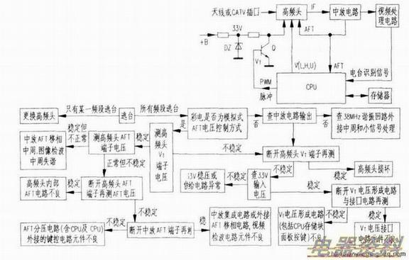 顺便说明:若是新型大屏幕彩电,因AFT电压已被CPU加至高频头VT端子。所以中放电路送出不正常AFT电压,也会导致VT电压不稳。