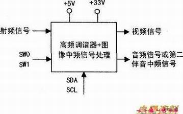 其图像公共通道电路有两种电路结构:一种为组合型结构,另一种为独立型结构。组合型结构指图像公共通道电路采用的是外观形似高频调谐器的组件。组件内部包括高频调谐器和图像中频信号处理两大部分(如右图所示)。组件正常工作的外部条件非常简单,只有电压+5V、调谐电压+33v、幅频特性选择控制信号SW0和SW1、总线信号SDA和SCL。习惯上将此组合型电路组成的器件仍称之为高频调谐器。只不过这时的高频调谐器输出的已不是图像中频信号,而是视频全电视信号和音频信号(或第二伴音中频)。若所维修彩电采用的是此类器件,故障现象为故障1,更换此组件即可故障排除。