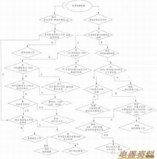 此类故障应重点检查稳压环路和+5V电路。检查稳压环路应以光电耦合器V304及误差取样放大电路V301为中心,结合绯修数据进行对比判断,必要时诃对V304、V301及外围元件进行代换。R313、R314阻值大小直接决定输出电压的高低,更换时应选误差小的。值得注意的是:+5V电源带负裁能力差或过重,也将导致+12V及其他各组电输出异常,如C321、C318失效,VD308、VD315性能变差都将导致输出电压失常,此类情况直接用代换法一般能快速解决问题。下图是该电源检修流程图。