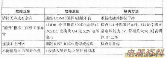 “酷开”板的常见硬件故障主要表现为无声、有杂音或网络连接不上,其故障原因与排除方法见下表。