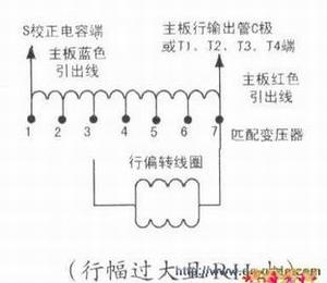 若遇到行幅很大且行偏转线圈很小时,通过各种手段使行幅调整不过来,说明其本身很大,即使由并联方式变为串联方式亦无法减小行幅,只有在行输出中加入匹配予以解决。匹配变压器是一个多抽头的自耦变压器,它可以进行阻抗的变换和能量的重新分配。而行幅的调整可以通过匹配变压器上抽头位置的调整取得最佳效果。在下图中,匹配变压器的两端接主板的两根线,输入端将全部的偏转能量都储存于匹配变压器中,而行偏转线圈从匹配变压器的不同抽头中提取合适的能量,从而达到使行幅减小的目的。