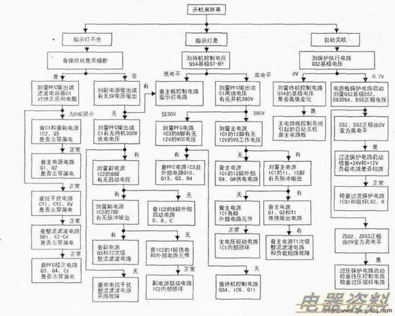板引发的黑屏幕故障较常见,主要是板不工作造成的。发生黑屏幕故障时,如果指示灯不亮,故障部位主要在AC220V市电电源输入的抗干扰、整流电路、副电源电路中;黑屏幕时指示灯亮,说明副电源的5v输出正常,多为待机控制电路和主电源电路故障;对于黑屏幕并有伴音的故障,多为背光灯电路发生故障,少数是主板亮度处理电路故障。有关FSP242-4F01电源板引发黑屏幕的检修步骤和方法见下图。