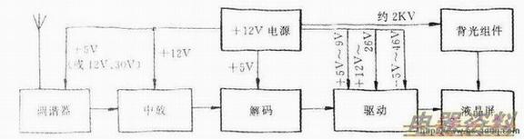 彩色液晶电视机体积小、重量轻、耗电少、无射线幅射,越来越受到人们的喜爱。彩色液晶电视机主要由器、中放、电路、驱动电路、液晶屏、背光源和供电电路等部分组成。其原理方框图如下图所示。遥控电视机则用CPU控制选台、亮度、色度、和音量等功能,一般都用I总线控制。