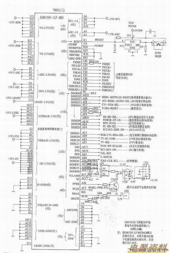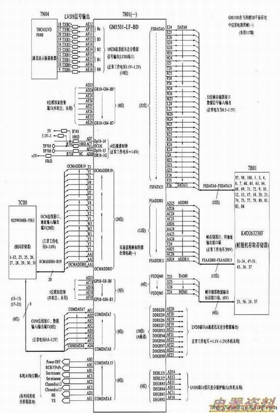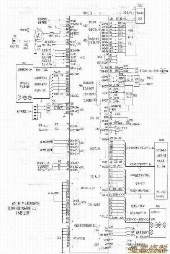 对于主芯片7801(CM1501)电路及外围元件的检查与维修,可参照下图进行。检修方法参考花屏、马赛克故障的检修与检测。其重点是检查主芯片与各之间的过桥孔,排阻的良好与否及焊接等。除此之外,还应注意与7MO03D芯片VGRNO~VGRN7的8位基色视频数据传输线路间有无断列或短路。与数字高清信号处理芯片7003(SII9993)YO~Y7、HDMl-CbCIo-HDMl-CbCr7走线间的线路情况。总之,有伴音、无图像故障涉及的范围很多,维修中注意具体情况作具体分析。