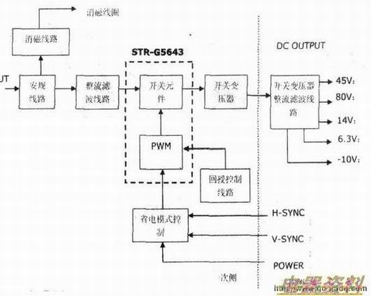 采用较特殊的芯片G5643D.维修方法和思路与UC3842电路有较大不同,不过由于C775电路较为简单,只要掌握一定的维修技巧,维修起来是很容易的,电源方框图见下图。