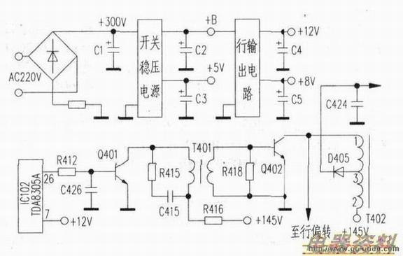 102(TDA8305A)(26)脚是行激励开关脉冲输出端,当其内部行振荡电路工作正常时,(26)脚直流电压为0.42V,行激励开关脉冲由此脚输出送至行推动管Q401b极,控制行推动、行输出电路的工作,达到提供正确行输出电压之目的。如果行开关脉冲频率不准,或行振荡电路不起振,则(26)脚电压将出现偏差,或无直流电压,行输出电路不能提供末级视放+200V电压。