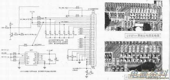 按上述方法代换主板后能出现测试画面,说明主板LVDS信号没有正常输出到逻辑板。仔细检查两个板子的地址之间的差异(上屏插座中有些脚接有,不同的屏的长虹产品,有些引脚接的是不同的,我们常将这些电阻叫做地址电阻)。下右上图是LT32710的屏地址电阻实物图,下右下图是LT37770的屏地址电阻实物图。