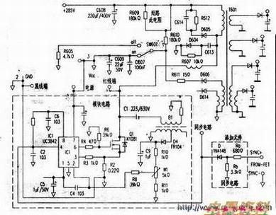 2.由于“万能模块”的启动电源来自开关驱动端,影响IC驱动电源的稳定。所以拆掉模块的启动,把本机的原启动电路用上(拆掉一只180kΩR609),而不用“方能模块”的工作电源(前提是本机厚膜V电源工作电压在16~18V左右,否则有部分UC3842会因过压而停机保护),有利于模块的稳定工作和寿命。至于稳压取样电路,经本人试验与在本机开关变压器取样稳压效果同样,所以为了简便,不必改动。