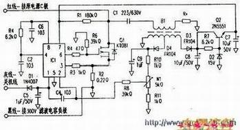 该万能模块中的1(UC3842)振荡驱动的工作原理这里不作分析。只简析其电路稳压取样与IC的工作电源取得的方法。IC1的工作由C1、B1、R*取得,启动R1也从开关管的D极(场效应管的漏极)取得。当C7电压充到IC1的启动电压时,IC1的⑥脚输出驱动脉冲,开关电源工作。开关管D极产生反峰电压,由于开关管开关时的反峰电压的高低同样反映了电压变化,由C1隔直,B1功率变换,R*(1kΩ)平衡限流,在脉冲的次级取出稳压取样电压和工作电源(二绕组的比值适当),由于工作电压变化范围宽,所以设置了由Q2、D2、R7组成的稳压供电电路。以保证模块在正常的工作电压下工作,达到多功能宽范围的应用。