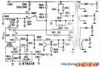 要适用于彩显的“万能模块”就需要增加行同步电路,彩显一般都在行变上绕有一匝行同步绕组(或小型同步变压器)引到开关电源部分,只要修改欲代换电路的同步电路,使电源振荡频率与行扫描频率同步即可。这里以代换成功的三星753DF彩显电源为例,介绍用万能模块代换厚膜DP104的方法,供参考。三星753DF电源电路如中图所示。