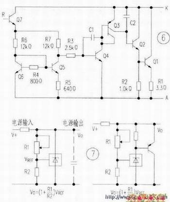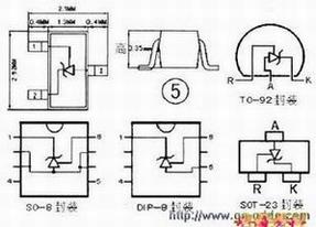 博克电子公司生产的LM431,在稳压中被广泛应用,具有良好的三端可分流基准源,它的电压输出可通过外围阻值调整得到2.5V~36V稳压。LM431标准动态0.2Ω,LM431三端基准稳压源封装形式及外形见图5,内部电路见图6,三个电极为参考极R、阳极A、阴极K。LM431的封装形式可分为TO-92、SC-8、-8、SOT-23。