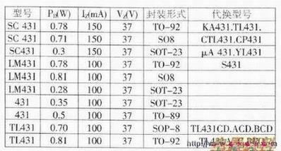 在LM431三端基准源内部电路中,有一个2.5V基准电压电路,在标准条件下工作在闭环状态中,输出电压VO参考R极电压反馈的作用,这时R1和R2的阻值确定时,两个对输出电压VO的分压取样送入内部电路,见图7。当输出电压VO增大时,反馈量也随之增大,其431内部电路对其分流也会相应加大,从而使输出电压VO下降,此时VO=(1+R1/R2)%VREF。调整R1的阻值,可使电路输出电压,从2.5V到36V输出,该件被广泛使用在、恒压源、恒流源等电路中。表1列出了贴片生产公司的431的主要参数,封装及代换表。