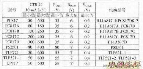 光耦合器的优点:抗干扰能力强,寿命长,传输效率高,输入端与输出端完全电隔离,其技术主要参数有:发光二极管的正向压降VF(单位V)、输入级与输出级之间的绝缘、集电极与发射极间反向、集电极与发射极间饱和压降、传输比(光耦合器的主要参数,当工作保持确定时,它等于直流输出电流与直流输入电流IF的百分比,CTR=(IO/IF)*100%)。右图是光耦合器817的Vce与发光二极管的正向电流IF以及Ic的关系。表2是光耦合器的直流参数及测试条件;表3是一些光耦合器的技术参数。