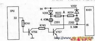 该机能接收PAL-4.43制和NTSC-3.58制。电路中LA7680的15脚是制式控制脚。16脚是副载波振荡输入脚,CPU的33脚输出制式控制。现在。假定我们希望让电视机工作在PAL-4.43制状态。如何确保做到这点呢?我们可以这样想:要让电视机工作在PAL-4.43制,那么4.43M的一定要接入电路工作,所以V201就必须导通(因Z201是4.43MHz晶振),这样,我们只要测量A点电压,如果低于9V,则V201必导通,V202必截止,电视机必定工作在PAL~4.43制状态;同样的道理,如果A点电压大于9V,则电视机必定工作在NTSC制状态。不仅如此,我们还可以推算出,在PAL-4.43制状态,V757导通(为了使A点电压低);V756截止(为了使V757导通);CPU的33脚为低(为了使V756截止)。