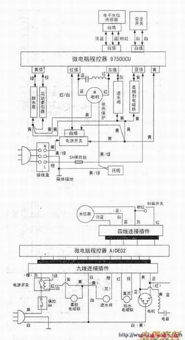 根据实际维修经验看,97500CU单片不易购到,所以可用8051、8751进行代换,只需对个别引脚稍加改动即可。实际上,在爱德牌(Aide)XQB-18上应用的为97500CU,在爱德(Aide)XQB45-1D型机上使用8051单片控制器,根据实际维修经验,可用市售的Aide45-1D牌洗衣机的电控板总成进行代换。代换时应注意:(1)XQB-18机采用牵引电机,工作为AC200V,而XQB45-1D则采用直流电磁阀;(2)门开关(安全开关)前者采用双线(白色)进入电脑板,后者为单线,需将另一根线接入水位取样:(3)前者原板采用6个二线插头,后者采用九线和四线插头合一个。代换时,应按功能一一对应。代换前、后的实际接线图见上图、下图。