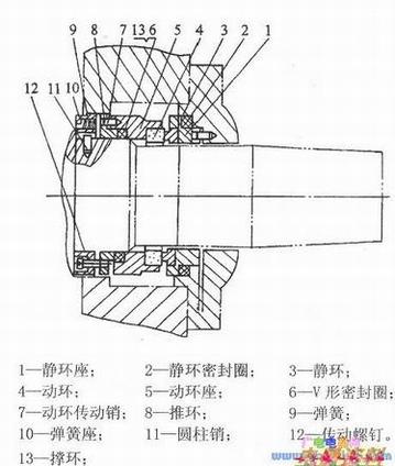 (9)装上轴封弹簧座、弹簧、推环、密封圈、动环及静环等零件,最后将轴封盖的连接螺钉紧固,如下图所示。在装配上述零件时,应涂上润滑油。