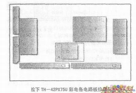 很多彩电,当不同的板出现问题时,可通过指示灯的闪烁次数反映出来,维修人员根据指示灯的闪烁情况,即可判断出彩电的具体故障部位。下表给出了松下TH-42PX75U彩电电源指示灯闪烁次数、故障内容与故障检查点,表中各电路板位置示意图如下图所示。