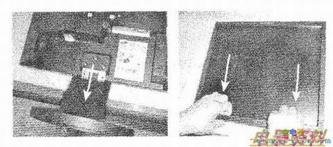 (1)将显示器面板朝下,放在加有软垫的桌面上,从支架上取下三颗螺钉,如下图所示。