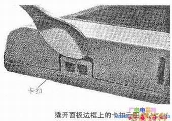 (2)在面板的边框上有3个卡扣,小心用工具(如小勺)撬开,如下图所示。