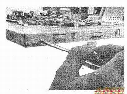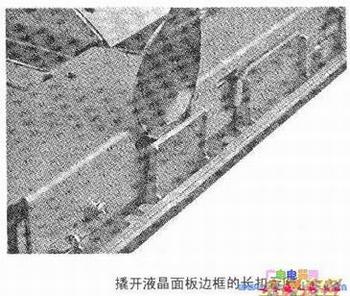 (6)用工具(如小勺)将液晶面板边框的卡扣撬开,如下图所示。注意左、右边框上各有四处卡扣,要全部撬开。