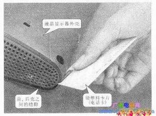 有些液晶显示器外壳四周是由一排小卡扣进行固定的,通常可用硬塑料卡片,如废弃的电话卡等从一定角度插入到前、后壳之间的缝隙中,稍用力向下滑,即可将外壳分离,具体方法如下图所示。