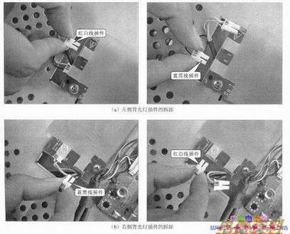拆卸电路板之前,要先将各个连接插件拔下,如下图所示。在该步操作中,需要记录每组插件连接导线的颜色,防止安装时接反,损坏背光灯器件。