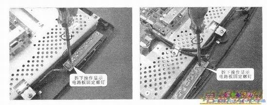 ②逆变器电路板的拆卸。逆变器电路板也是为背光灯供电的电路板,该电路板由固定螺钉固定在金属屏蔽盒上,并且电路板两端与背光灯组件通过两组连接插件相连。