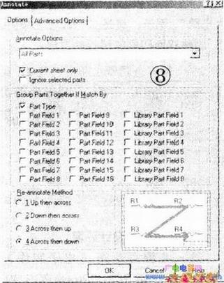 如果电路比较复杂,用上述人工编辑元件序号时可能会出现重复、漏编、错编等情况,自动布线时会出错,因此,执行Protel的自动重编元件序号功能,可以避免差错。在“两级放大电路.Sch”设计窗口下,单击菜单Tools/Annotate...,将出现Annotate对话框如图8所示,在Options选项下,单击AnnotateOptions栏的下拉箭头,在下拉列表中选取AllParts.然后单击下方“ok”按钮,将自动生成“单管放大电路.ERP”文件,同时在打开的“单管放大电路.ERP”文件窗口中可见:重编序号后,R1的序号重编为R9;R5的序号重编为R10,Cl的序号重编为C6……等等。