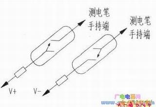 在直流中发生断路故障,一般情况下多用查找断路点,当断点距离较远时这样做很麻烦,需要较长的引线,操作起来很不方便,并且需要两人或者多人配合进行。由于测电笔测试直流电路时,其氖管会呈一端发亮(编者按:如右图所示,试电笔测接V+时,氖管接触电的电极弯段根部亮:试电笔测接V-时,氖管手持端电极弯段根部亮)。