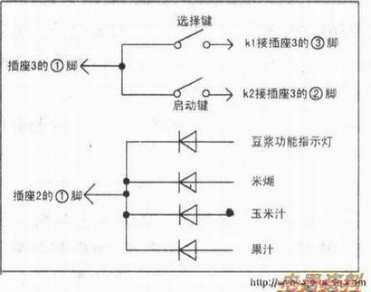 插座2:接面板指示灯用的。(1)脚公共端接的负极;(2)脚接果汁功能指示灯。(3)脚接玉米汁功能指示灯;(4)脚接米糊功能指示灯;(5)脚接豆浆功能指示灯。