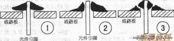 (I)虚焊部位在焊点与焊盘之间如图1所示。产生这种虚焊现象的原因是虽然元件引脚处理得好。但线路板敷铜焊盘面上没有处理好。导致焊接时吃锡不充分造成的。这种虚焊现象由于隐藏在焊点下面。一般不容易发现。