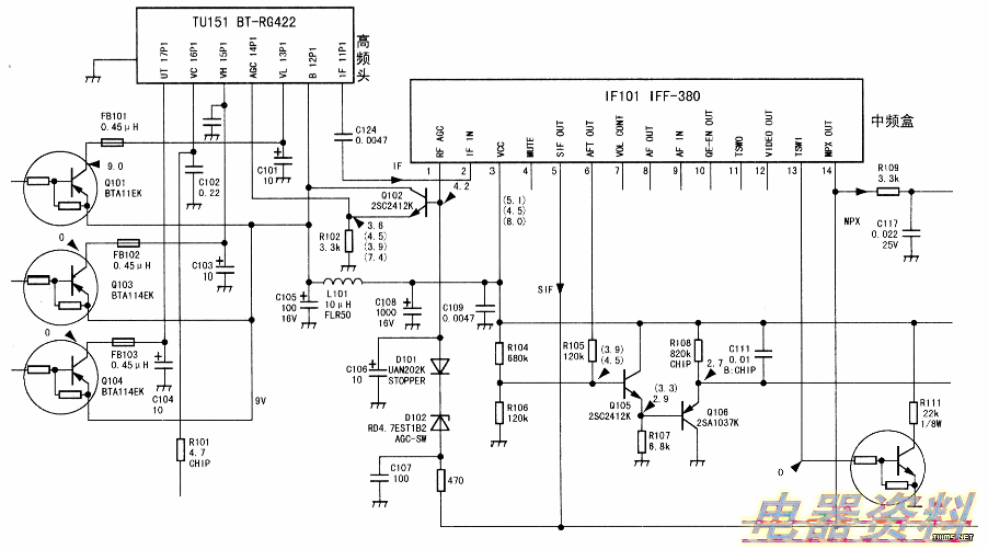 信号源选择电路在选用AV3信号时正常,还不能完全确认选择及相关电路正常。为做更进一步的检查,可将电视机置于TV状态,在出现黑屏故障时,用外接的视频图像信号源通过一只47μF~220μF的连接至下图所示中频盒的VIDEOOUT(12)脚,并注意观察故障变化。