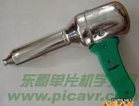 - 热风枪这是拆多脚的贴片元件用的,也可以用于焊接。买专用的比较贵,可能要一、二百元以上,国内有一种吹塑料用的热风枪(下图左边),只售五、六十元,很多卖电子元件的店都有卖,很合用。我测过它吹出热风的温度,可达400 – 500 度,足以熔化焊锡。