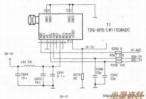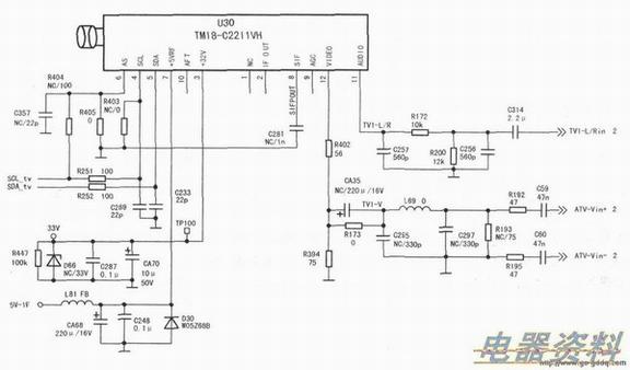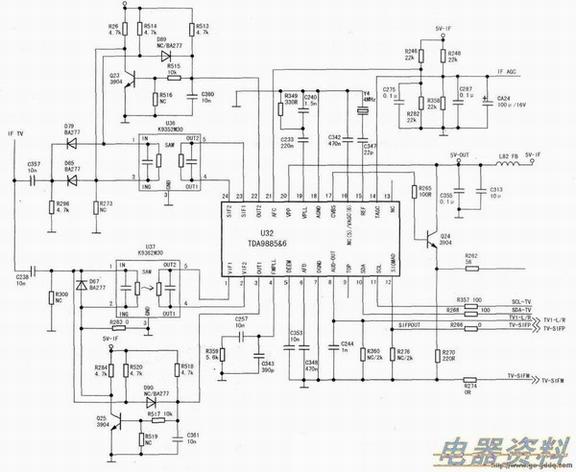 采用该集成块生产的整机而言,如果不考虑和液晶屏的结构情况,其电路结构通常有两种:一种是整机的图像公共通道电路采用独立高频器型和独立中频信号处理型,如海尔LB32R3液晶电视。上图是此类电路中的高频调谐器电路原理图,中图是此类电路中的图像中频信号处理电路原理图。上图中的高频调谐器工作状态受总线信号和高放AGC控制,输入射频信号,输出图像中频信号。而中图中的图像中频信号处理电路除集成块工作状态受总线控制外,其作用与早期由独立组成的图像中频信号处理电路并无多大差别,在总线信号控制下,也是完成图像和伴音中频信号的放大、检波等处理。输入图像和伴音中频信号,输出高放AGC电压、视频全电视信号和音频信号。