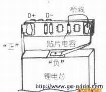 但在具体实施时叉遇到了问题:因D一电极板下的焊点在电池生产时已被一些绝缘物封死,无裸露焊点可供焊线。此后测到附图中所示的一只贴片的焊点与D-极为互通,遂用一根很细的绝缘皮导线,把该点与板条右端电池芯负极所接焊点直接“跨接”焊好,接下来再将导线顺板条边缘整理平顺后,重新把锂电芯部分装入原电池壳架并原纸封好。装到“万能充”上一试,检测灯点亮,说明D+、D-电极上电压已1灰复,经充电至充电器显示“充满”后,取下装上手机一试.使用发现与新电池没有任何差异。