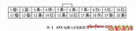 源取消了传统的交流电源开关,它采用软开关技术,依靠+5SB、Power On/Off控制信号的组合来实现电源的开启和关闭,使计算机的远程控制和定时开关机功能顺利实现。传统AT电源采用两组插头与主机板联接,每组各有6根线。与AT电源不同,ATX电源采用一组20线插头,其具体接线如图所示: