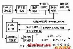 城CGCATX2K电源为例对ATX电源作介绍,CGCATX2K是长城公司新出的一款优秀的电源,性能稳定,输出功率大,其详细经本人参照电路板手工绘出,如图5所示。因保护知识产权的原因 ,本文对所有元件进行了重新编号并略去了元件型号。但这不影响我们对电源原理的理解和分析。此电源采用技术,开关电源具有转换效率高且便于控制的优点,下面是电源电路的框图,如图2所示。