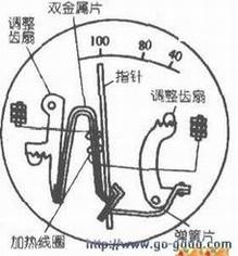 水温指示表和传感器内的检验方法及用具,和油压表检验内时的方法及用具相同;检验和调整水温指示表指针在各种规定下的偏斜角度的方法、用具与油压表相同。经过检验,若指示表的示数不准,可按机油指示表那样,从表背后的调整孔中调整齿扇,使指针分别指在100℃或40℃(如上图所示)。若电流值大干上述规定,则证明电热线圈已经烧坏,造成了短路。若根本无电流通过,则证明线圈已经断路。因此,无论是短路或断路,均应进行仿制修复。修复后,还必须进行检验调整无误后,方为修好。传感器输送电流的检验和调整,首先将传感器的尖端和水银温度表浸在水中,并将传感器与标准指示表、及加热槽等组成一个串联的检验。