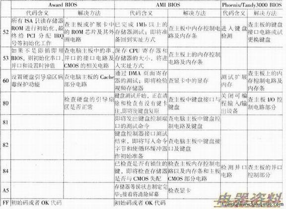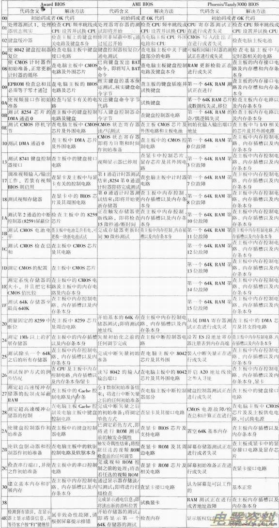 电脑主板的BIOS在每次开机时,会对系统的、、键盘、视频部分、硬盘、软驱等各个组件实行严格测试,井分析硬盘系统配置,对已配置的基本I/O设置进行初始化,一切正常后,再引导操作系统。其显着特点是以是否出现光标为分界线,电脑开机后先对关键性部件进行测试,若关键性部件发生故障强制机器转入停机,显示器无光标,则屏幕无任何反应;若关键性部件检测通过.则对非关键性部件进行测试,如有故障,机器也继续运行,同时显示器显示出错信息。当机器出现故障,尤其是出现关键性故障,屏幕上无显示时,将诊断卡插入扩充槽内,根据卡上显示的代码,参照机器所属地BIOS类型,再通过查出该代码所表示的故障原因和部位,就可清楚地知道故障所在。