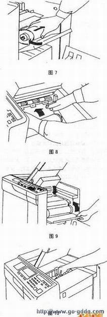 (IO)合上蜡纸装载单元和原稿台见图10,轻轻地合上蜡纸装载单元,并将原稿台复位。如果说蜡纸头放到绿胶片下太多,多余部分将被自动剪切掉,剪切的蜡纸条还在里面时,面板上的CHECKSETTINGC指示灯闪亮,提示请拿走蜡纸条。